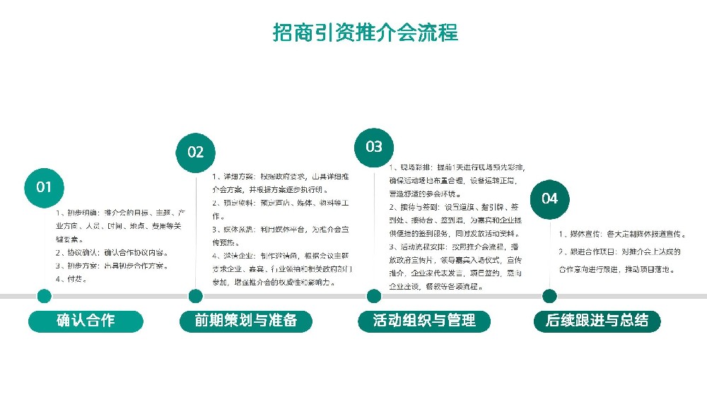 SINCERE SERVICE招商引資推介會流程01確認(rèn)合作1、初步明確:推介會的目標(biāo)、主題、產(chǎn)業(yè)方向、人員、時間、地點(diǎn)、費(fèi)用等關(guān)鍵要素2、協(xié)議確認(rèn):確認(rèn)合作協(xié)議內(nèi)容3、初步方案:出具初步合作方案4、付費(fèi)02前期策劃與準(zhǔn)備1、詳細(xì)方案:根據(jù)政府要求,出具詳細(xì)推介會方案,并根據(jù)方案逐步執(zhí)行2、預(yù)定物料:預(yù)定酒店、媒體、物料等工