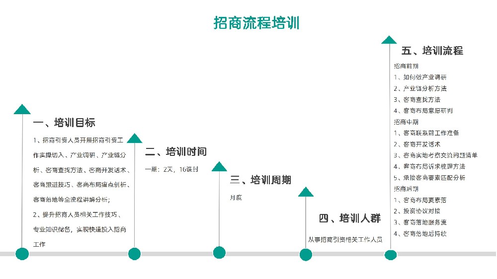 招商培訓(xùn)流程一、培訓(xùn)目標(biāo)1、招商引資人員開(kāi)展招商引資工作實(shí)操切入、產(chǎn)業(yè)調(diào)研、產(chǎn)業(yè)鏈分析、客商查找方法、客商開(kāi)發(fā)話(huà)術(shù)、客商跟進(jìn)技巧、客商布局痛點(diǎn)分析、客商落地等全流程講解分析2、提升招商人員相關(guān)工作技巧、專(zhuān)業(yè)知識(shí)儲(chǔ)備、實(shí)現(xiàn)快速投入招商工作二、培訓(xùn)時(shí)間一期:2天,16課時(shí)三、培訓(xùn)周期月度四、培訓(xùn)人群從事招商引