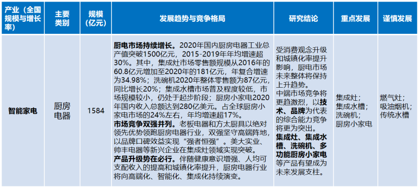 廚房電器行業。受消費觀念升級和城鎮化率提升影響,廚電市場未來整體將保持上升趨勢。中端市場競爭將更趨激烈,以技術、品牌為代表的綜合能力競爭將更為突出。集成灶、集成水槽、洗碗機、多功能廚房小家電等產品有望成為未來發展支柱。