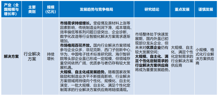 行業解決方案。市場整體處于快速發展期,國內外雖已初現部分龍頭企業,但未來對優質企業仍有較大發展空間;大規模、自主化、滿足個性化定制需求的行業解決方案供應商將成為重要發展趨勢。