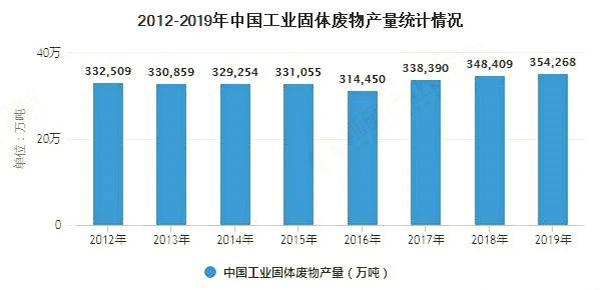 工業固體廢物是工業生產過程中排入環境的各種廢渣、粉塵及其他廢物。可分為一般工業廢物(如高爐渣、鋼渣、赤泥、有色金屬渣、粉煤灰、煤渣、硫酸渣、廢石膏、脫硫灰、電石渣、鹽泥等)和即危險固體廢物。從下圖表數據可以看出,2012-2019年,我國工業固廢產生量呈波動變化,2012-2016年產生量波動下滑,2017年以后產生量小幅增長。初步測算2019年,全國工業固體廢物產生量35.43億噸,比上年增加1.68%。
