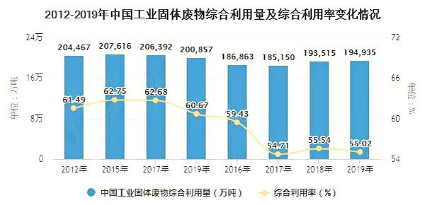 從下圖表數據可以看出,2012-2019年,我國工業固廢綜合利用量波動變化,整體表現為2012-2017年工業固體廢物的綜合利用量波動下滑,2018-2019年工業固體廢物的綜合利用量小幅上升。2019年,全國工業固廢綜合利用量19.49億噸,同比增長0.73%,工業固體廢物的綜合利用率為55.63%。綜合來看,我國工業固體廢物的綜合利用率還有明顯的提升空間。