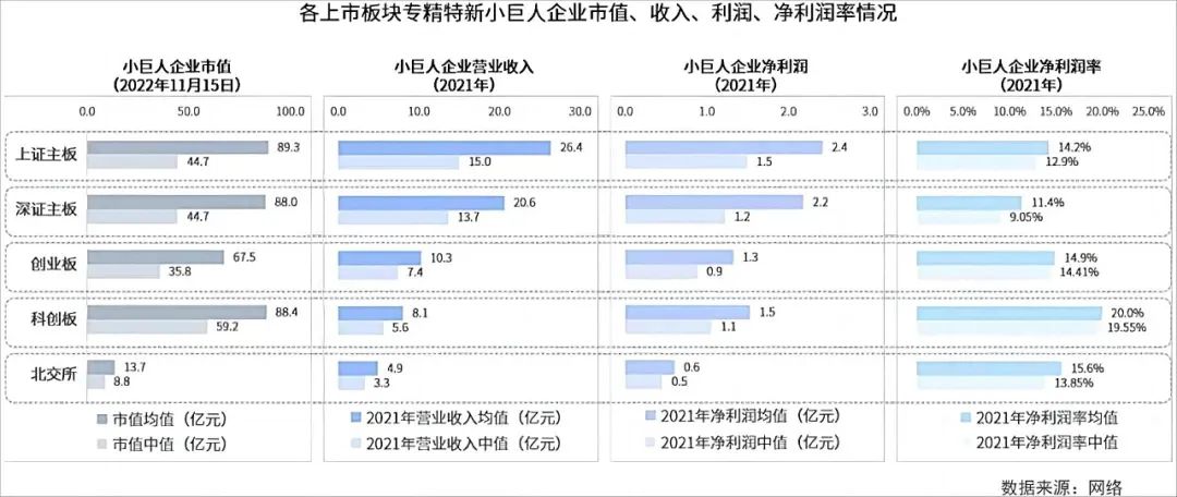 主板小巨人規模最大,科創板小巨人凈利潤率最高,北交所企業規模尚小
