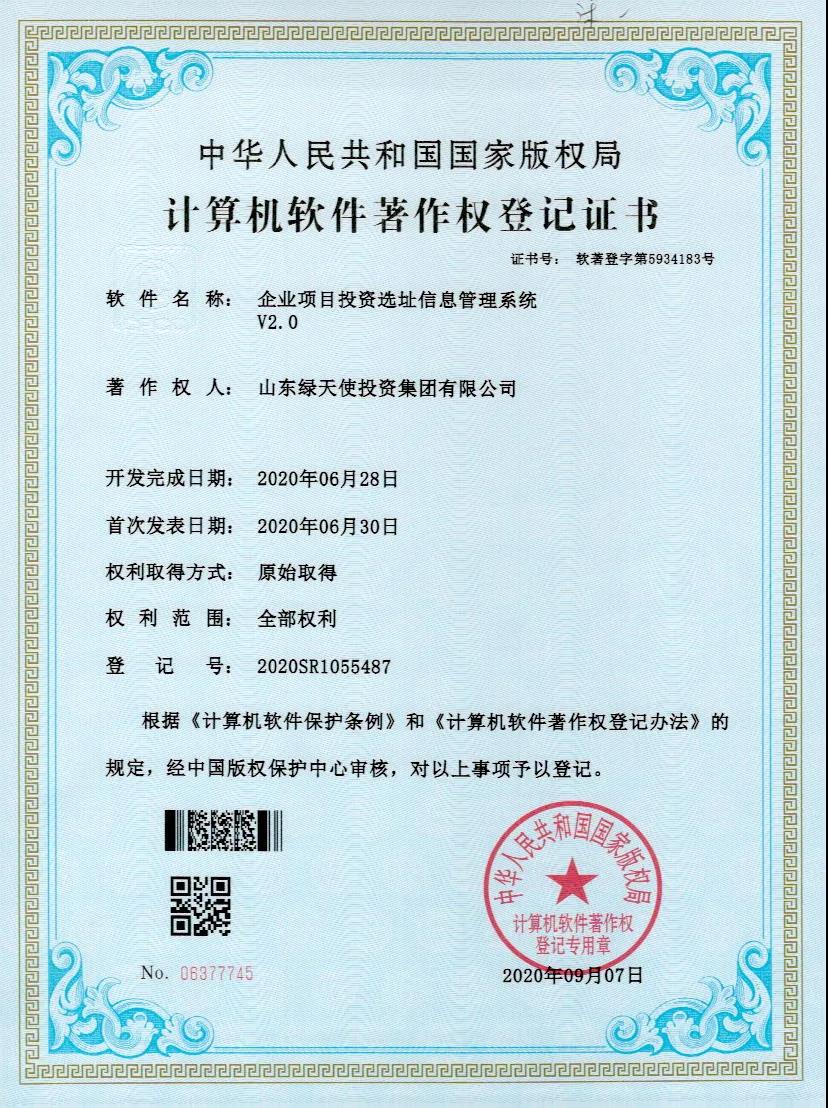 近日,綠天使自主設(shè)計(jì)與研發(fā)的兩款軟件產(chǎn)品——“招商引資項(xiàng)目管理系統(tǒng)V2.0”、“企業(yè)項(xiàng)目投資選址信息管理系統(tǒng)V2.0”——獲得國家版權(quán)局計(jì)算機(jī)軟件著作權(quán)登記證書。