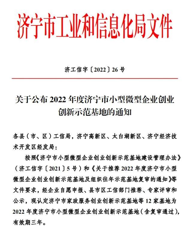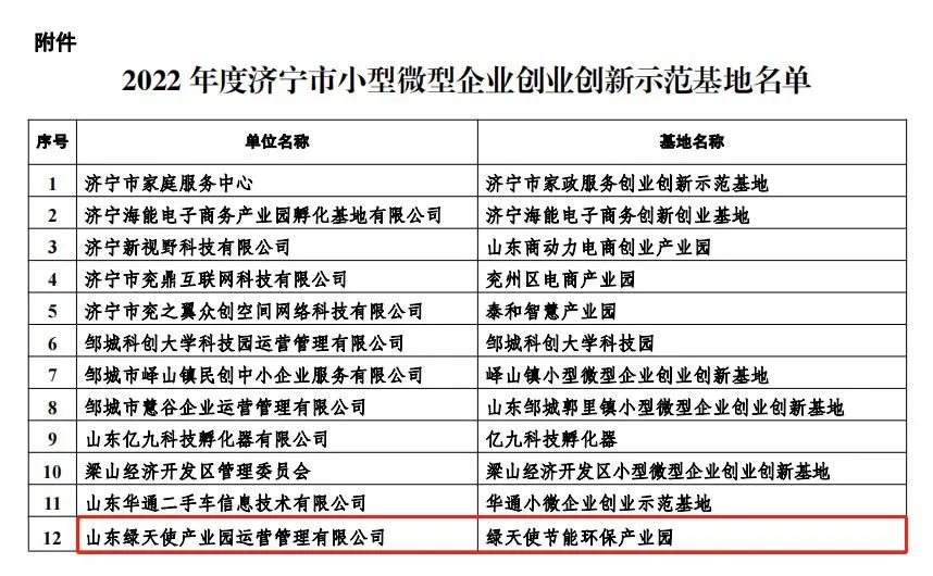 近日,濟寧市工業(yè)和信息化局公布了2022年度濟寧市小型微型企業(yè)創(chuàng)業(yè)創(chuàng)新示范基地名單,綠天使?jié)鷮幑?jié)能環(huán)保產(chǎn)業(yè)園入列其中,被認(rèn)定為濟寧市小型微型企業(yè)創(chuàng)業(yè)創(chuàng)新示范基地。