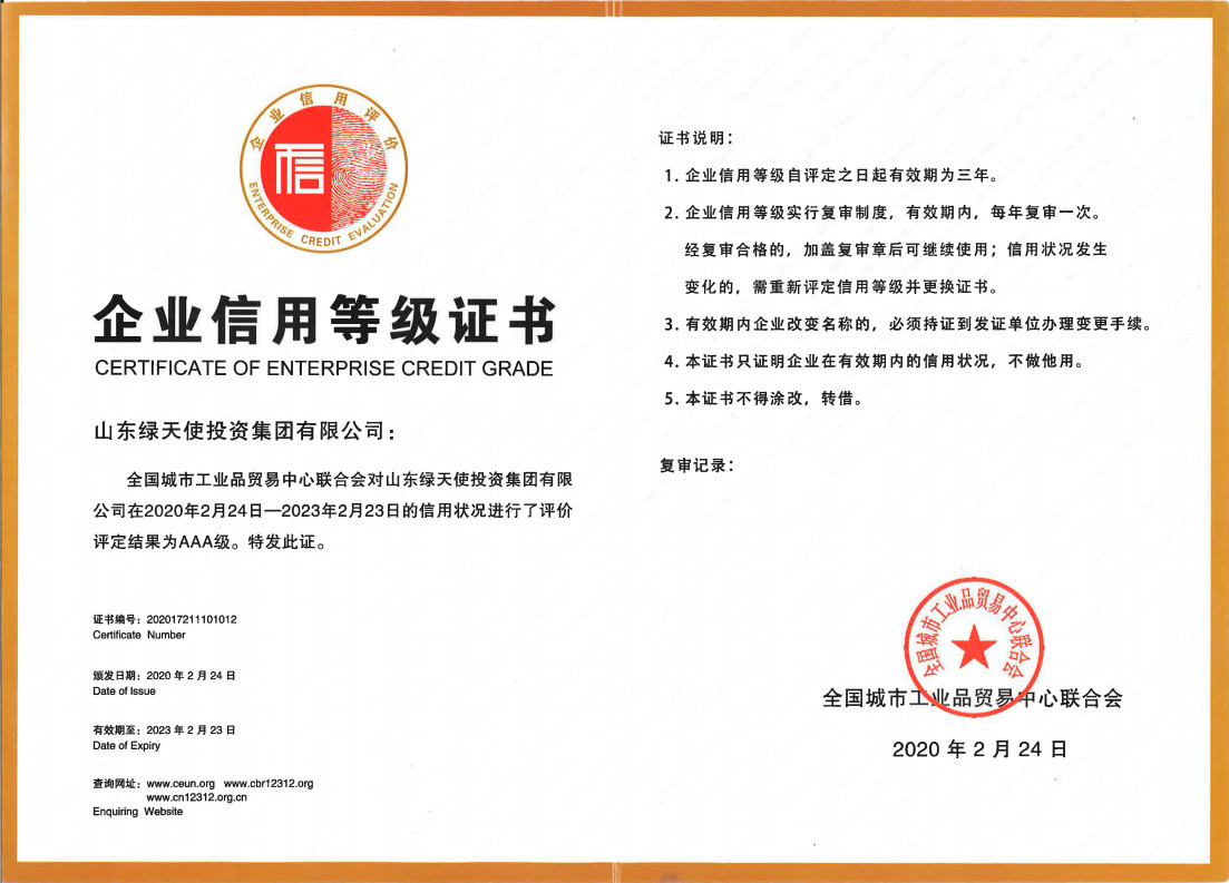 熱烈祝賀綠天使集團(tuán)榮獲AAA企業(yè)信用等級(jí)證書