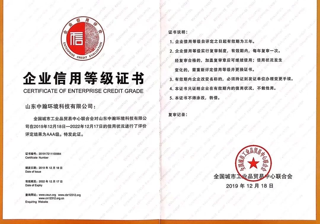為加強(qiáng)中國(guó)行業(yè)的誠(chéng)信建設(shè),推動(dòng)行業(yè)自律,近日,山東中瀚環(huán)境科技有限公司在綠天使指導(dǎo)咨詢(xún)下完成了AAA信用體系申請(qǐng)認(rèn)定各項(xiàng)工作,并獲得由國(guó)家商務(wù)部和國(guó)務(wù)院國(guó)資委授權(quán)國(guó)家一級(jí)行業(yè)協(xié)會(huì)頒發(fā)的企業(yè)信用評(píng)級(jí)AAA等級(jí)認(rèn)定資質(zhì)。