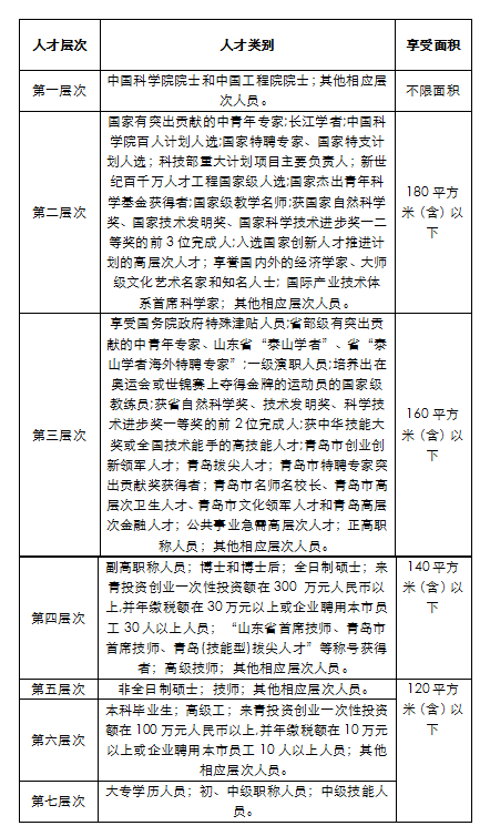 第一層次人才不限面積;第二層次限制180平方米(含)以下;第三層次人才限制160平方米(含)以下;第四層次人才(含全日制碩士)限制140平方米(含)以下;第五、六、七層次限制120平方米(含)以下。