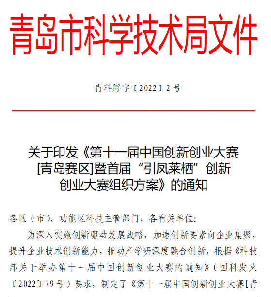 青科孵字〔2022〕2號關于印發《第十一屆中國創新創業大賽[青島賽區]暨首屆“引鳳萊棲”創新創業大賽組織方案》的通知